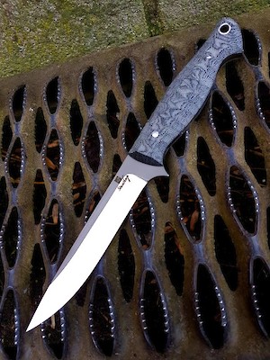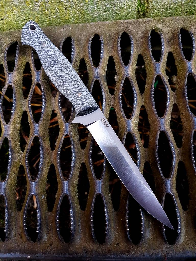 Price: £310 SOLD Highland Stalker S90V Highland Stalker model in highly wear resistant CPM S90V Model: Highland Stalker Blade Length: 5" Overall Length: 9.75" Thickness: 4mm Steel: CPM S90V @Rc60 Handle: Black Canvas Micarta Features: Stainless pins, black kydex sheath