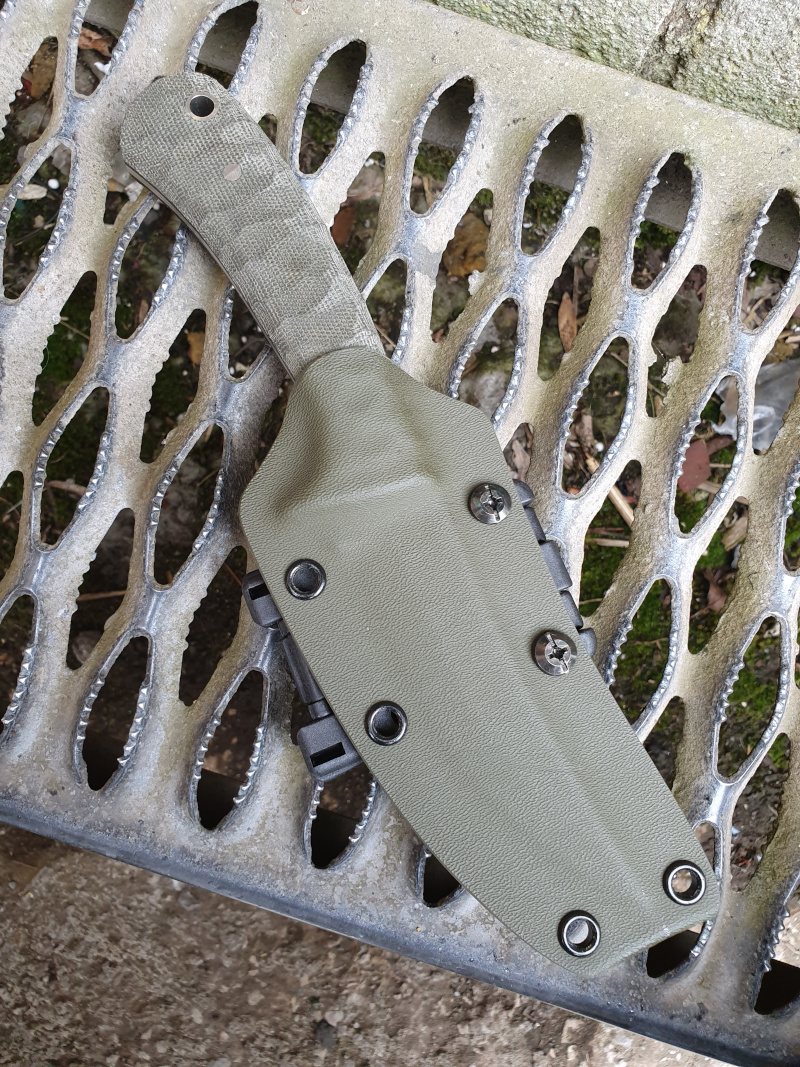 Features: Stainless pins, green kydex sheath with TekLok belt clip or webbing belt loop.